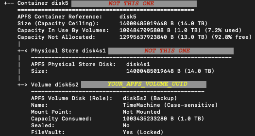 Locate the APFS Volume named your Time Machine volume (e.g., TimeMachine on my system), then copy its Volume UUID (not the container UUID). For example, on my system:
